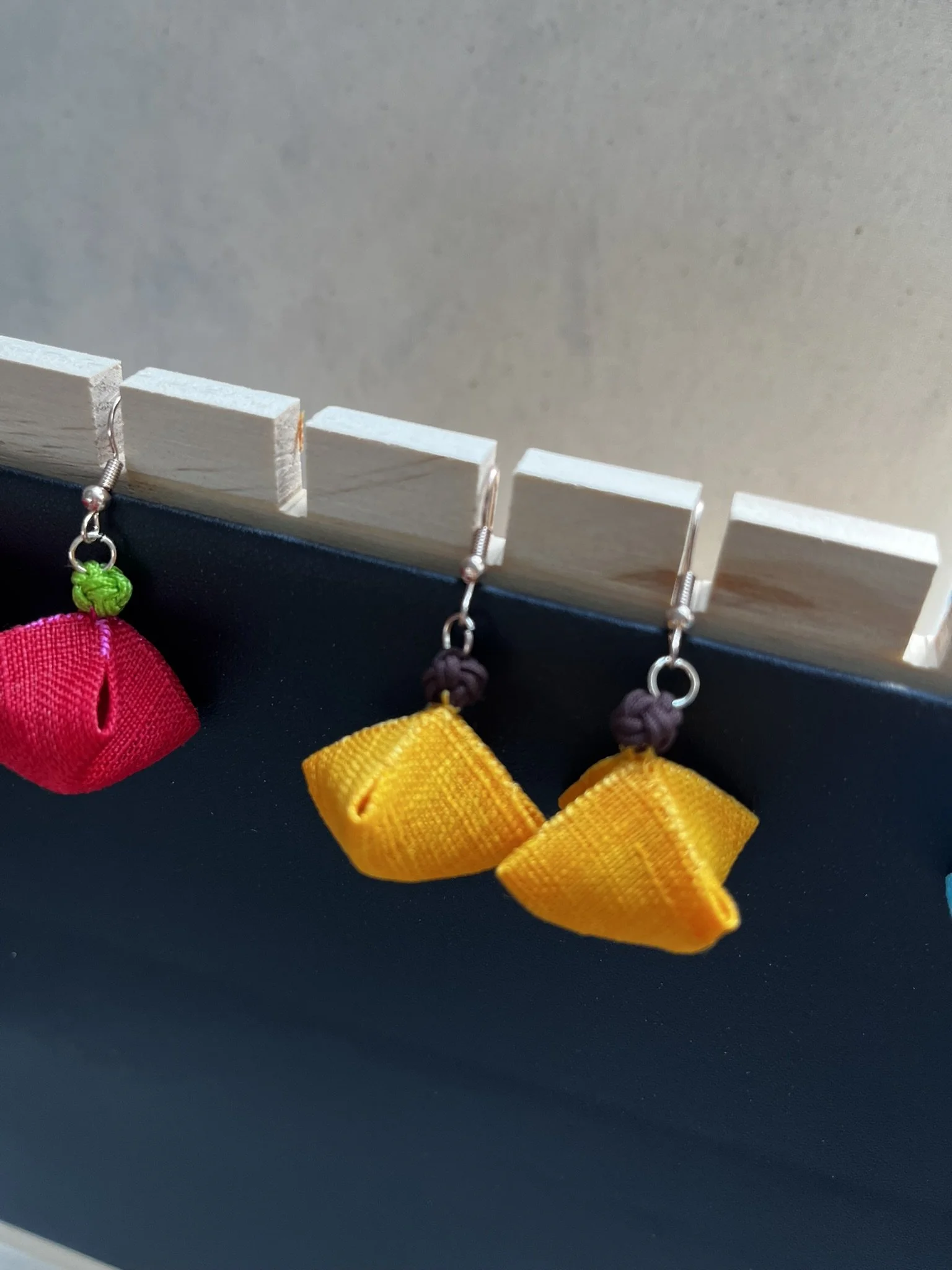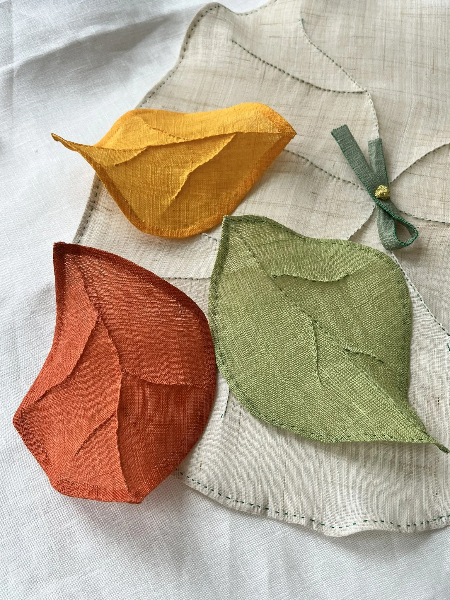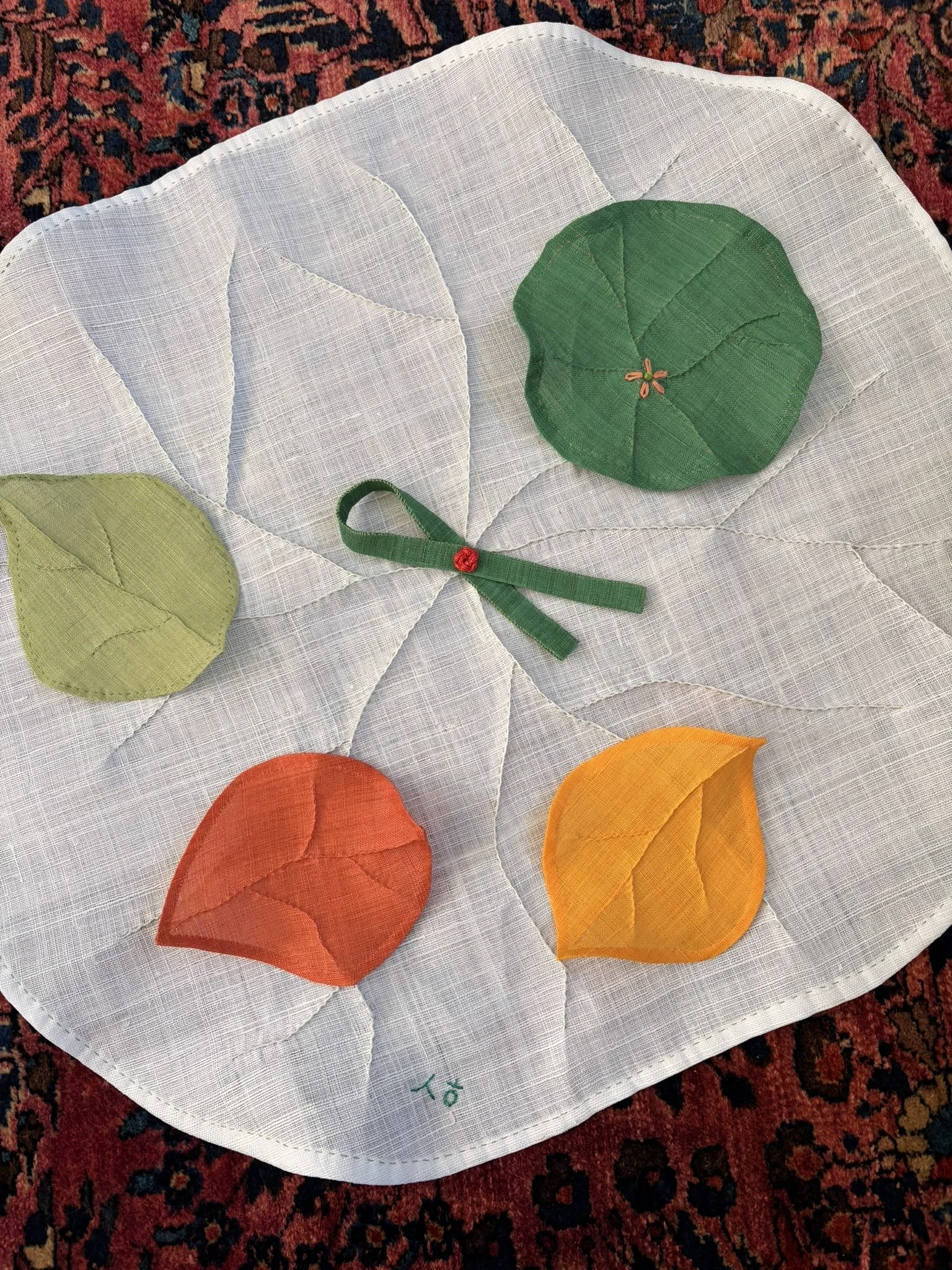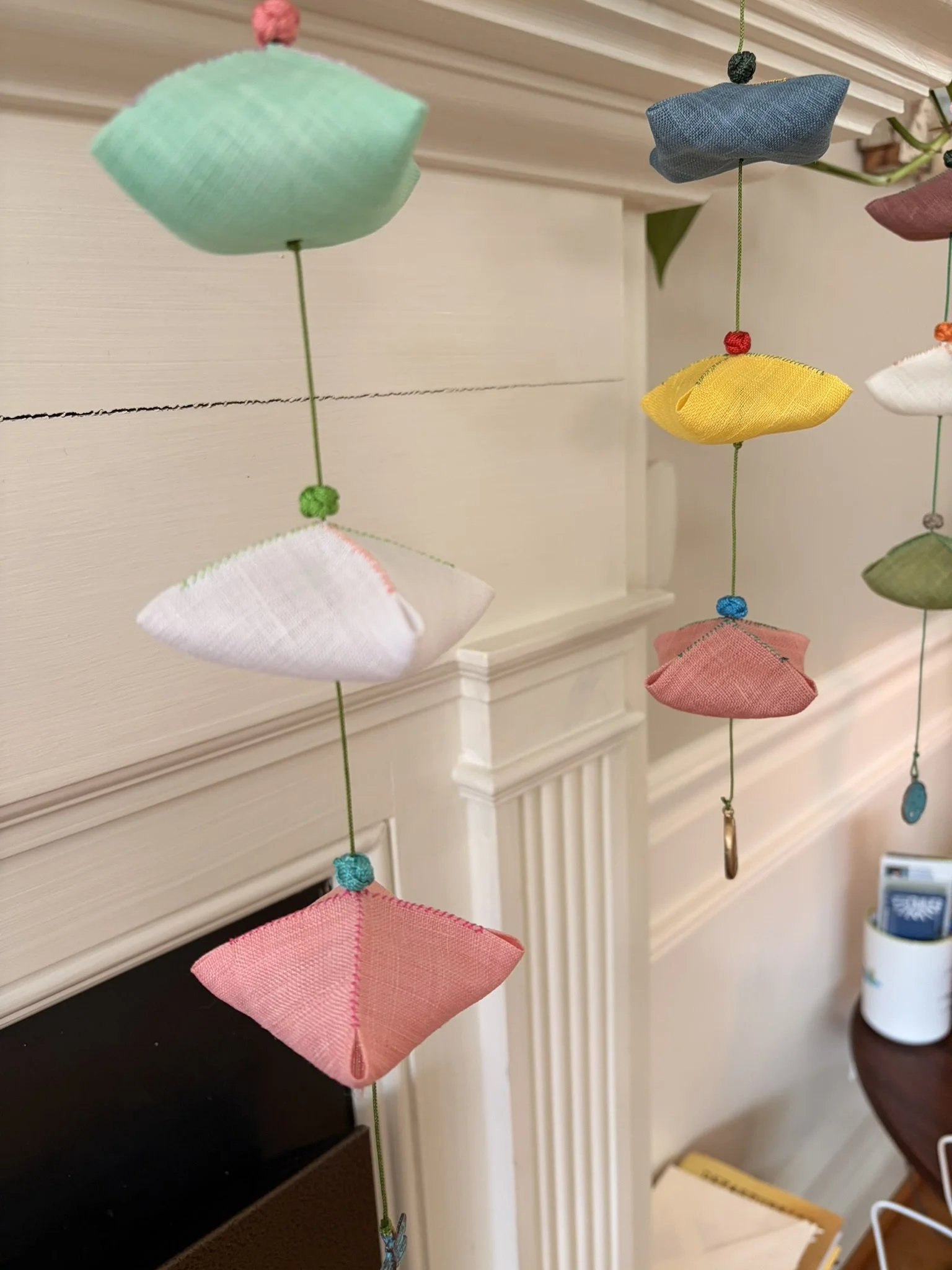 Small, hand-sewn shapes float in quiet balance, bringing color and gentle movement into space. Material: Ramie Linen, Lotus knots, beads, and Korean silk cords.